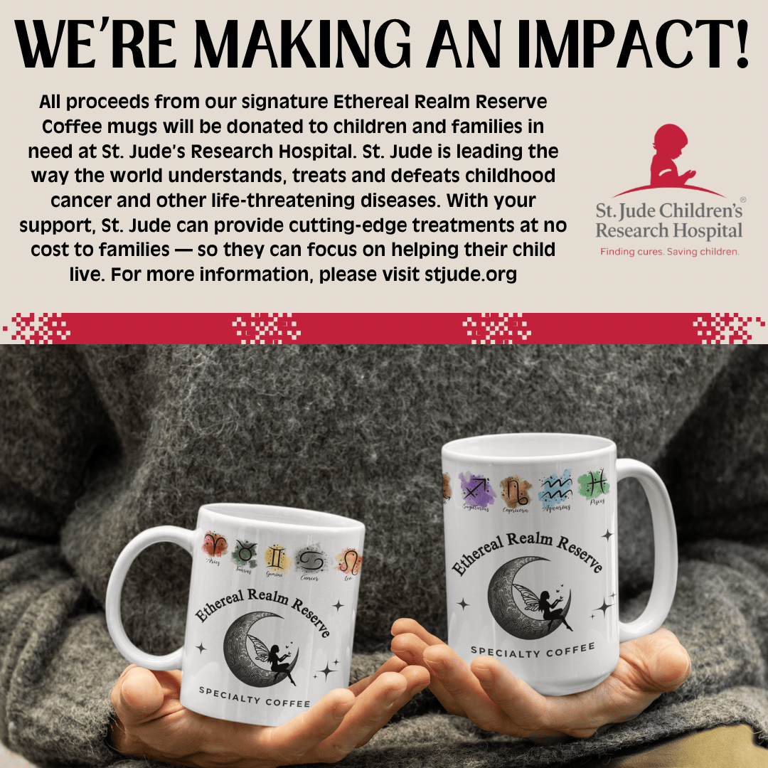 Every child is their parent’s angel, a precious soul full of promise and light. At Ethereal Realm Reserve, we believe in nurturing every angel’s journey to thrive and soar. That’s why all profits from the sale of our Signature Collection Coffee Mugs will go directly to St. Jude Children’s Research Hospital, an organization dedicated to ensuring children battling cancer and other life-threatening diseases get the chance to grow their wings.