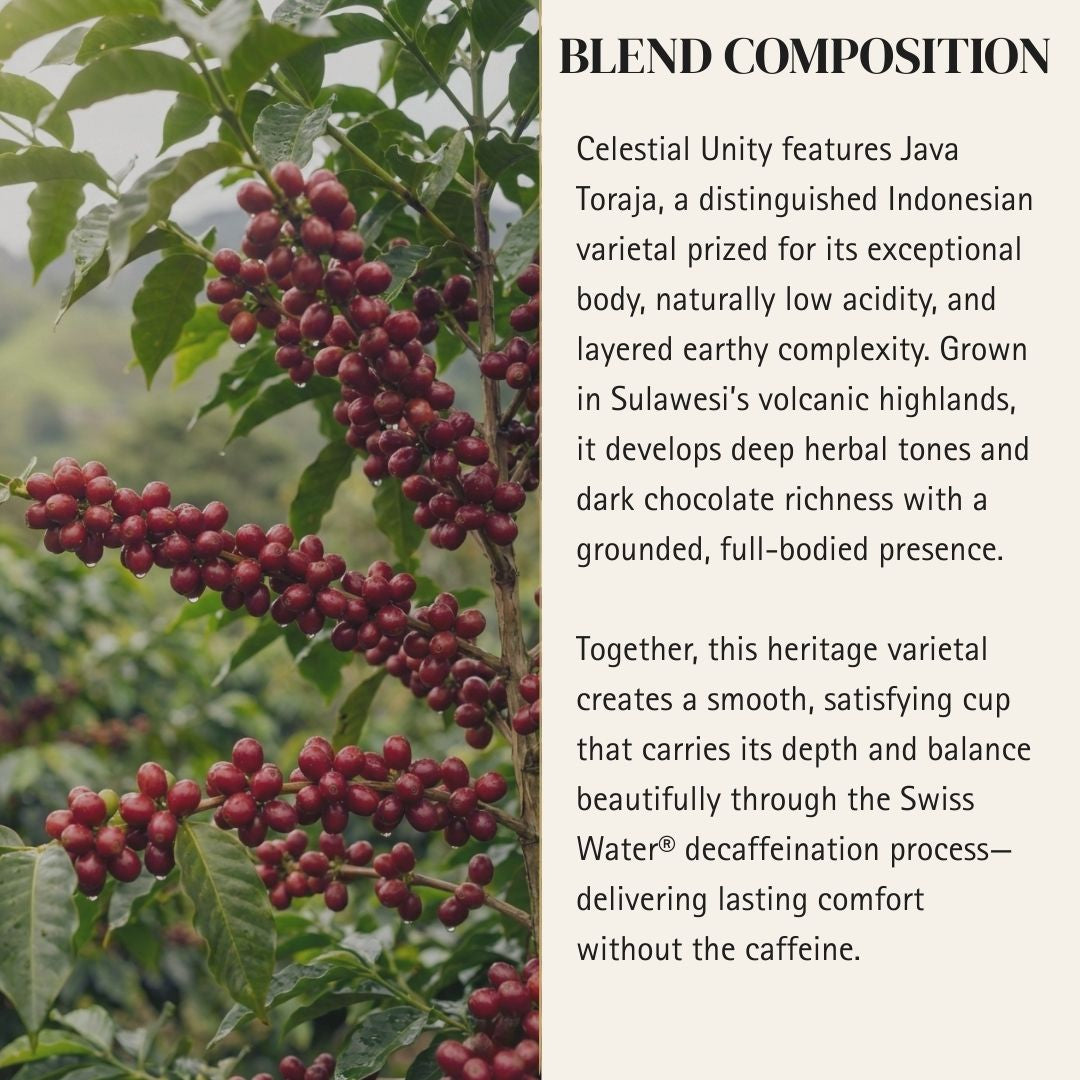 A smooth medium roast layered with earthy depth, herbal warmth, and dark chocolate richness. Full body and low acidity create a comforting, well-rounded cup that delivers distinctive character without the caffeine.