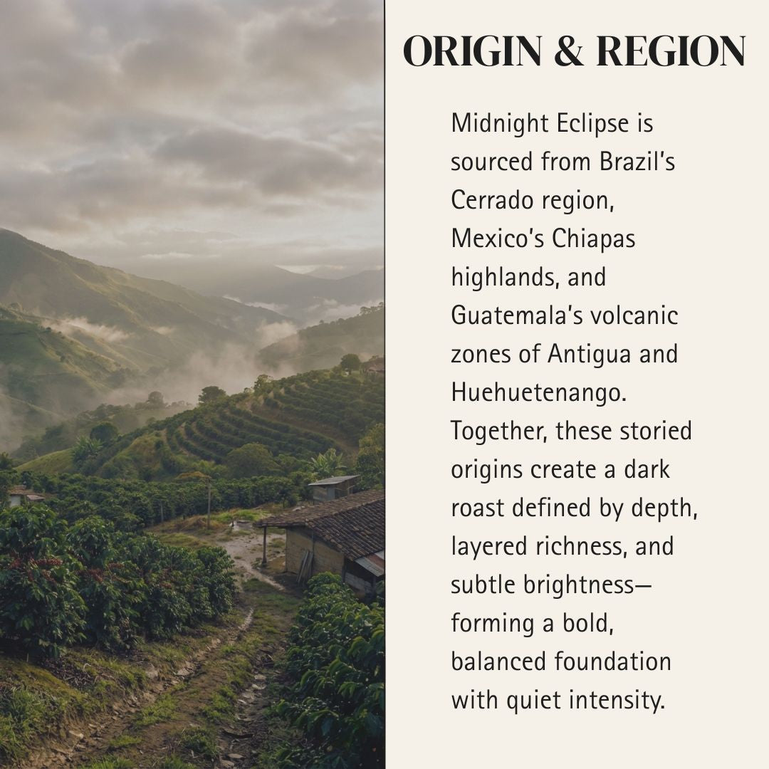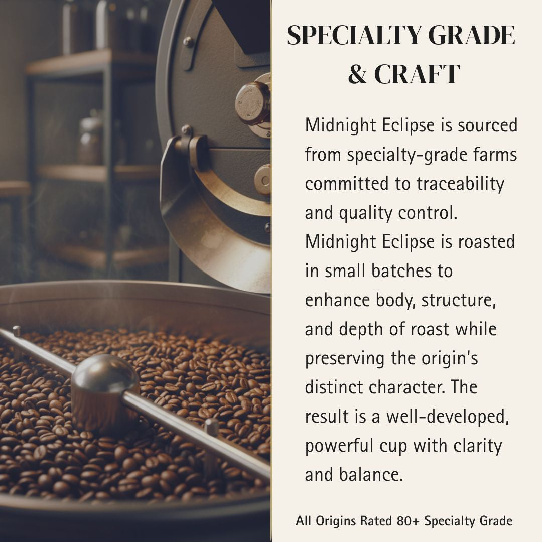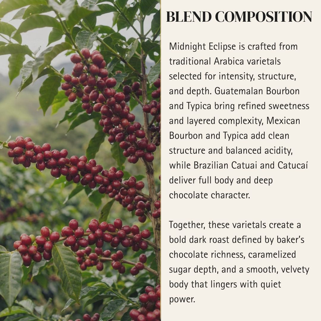 A deeply developed dark roast layered with cocoa richness and toasted nut depth. Heavy body and low acidity create a smooth, powerful cup with lasting intensity and controlled structure.