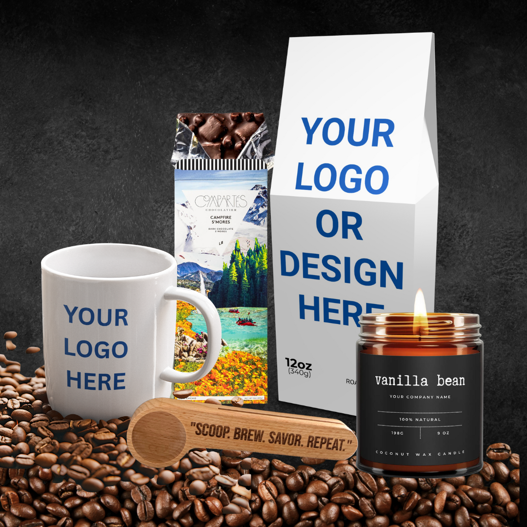 We also offer full customization across several of our products, allowing you to incorporate your company’s branding or event theme. Your coffee, mugs, candles, and even our dual-purpose coffee scoops can be personalized with your logo, artwork, or custom design. If you're interested in adding custom elements to your gift sets, simply reach out—we’d love to discuss your vision and help bring it to life.